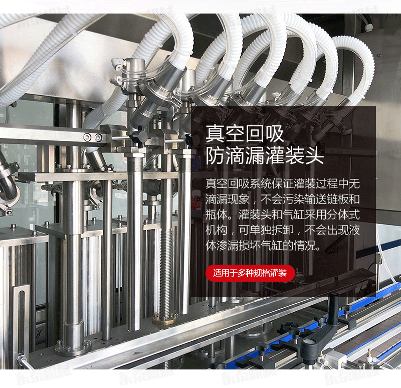 1.真空回吸系統(tǒng)保證灌裝過程中無滴漏現(xiàn)象,不會污染輸送鏈板和瓶體。灌裝頭和氣缸采用分體式機構(gòu),可單獨拆卸,不會出現(xiàn)液體滲漏損壞氣缸的情況。進口亞德客氣缸經(jīng)久耐用,其他密封等配件使用標(biāo)準(zhǔn)件,更換維護簡單方便。