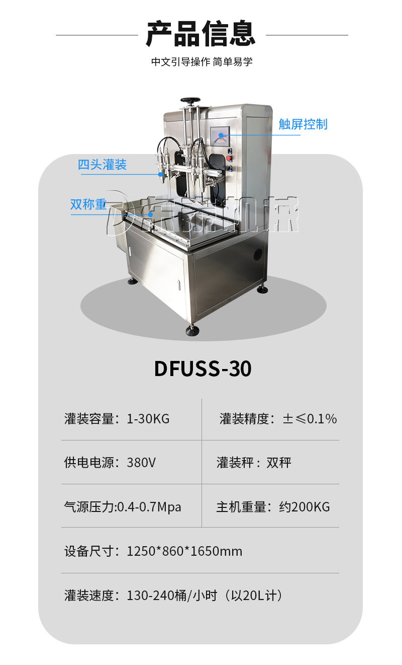 產(chǎn)品名稱:雙秤四頭定量灌裝機(jī) 型號(hào):DFUSS-30 產(chǎn)品說(shuō)明:   該灌裝機(jī)適用于各種油類以及粘稠液體的灌裝。如:潤(rùn)滑油、防凍液、化工原料等   &nbs