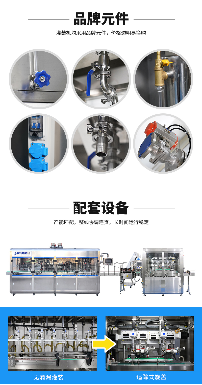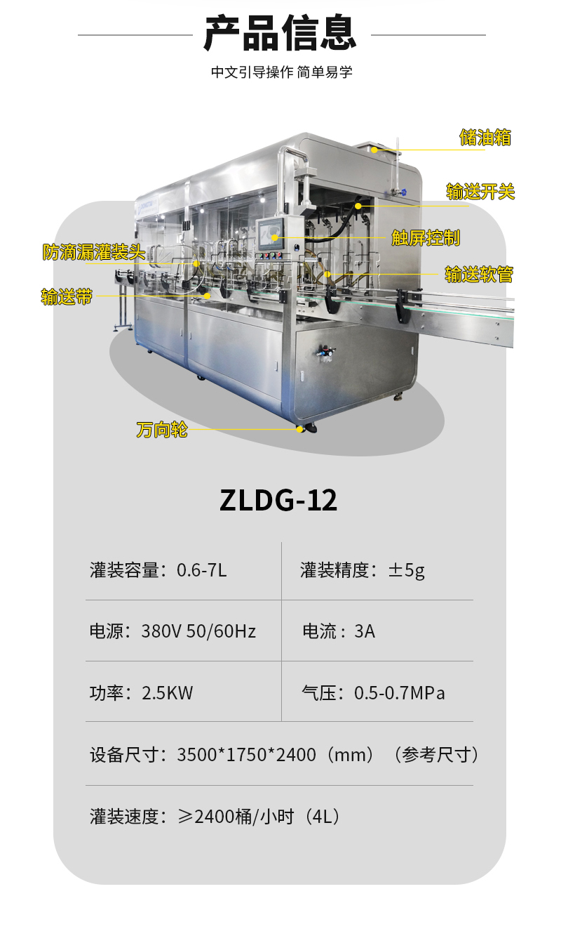 該灌裝機可以配置 高速旋蓋機 油桶貼標(biāo)機 油瓶噴碼機 油壺自動自動裝箱碼垛機。組成油脂灌裝包裝流水線。節(jié)能、自動化的設(shè)備。