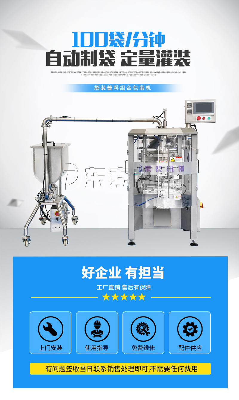 本機器主要用于調味品醬料的自動化包裝,機器安裝有橫向螺帶式攪拌,使油醬混合均勻,確保灌裝精度和產品包裝成品的均勻性。灌裝計量設備安裝有萬向輪,管路鏈接均采用快拆接頭,方便灌裝機拆卸移動清洗。包裝設備采用全伺服驅動器,包裝速度快,運行穩(wěn)定。