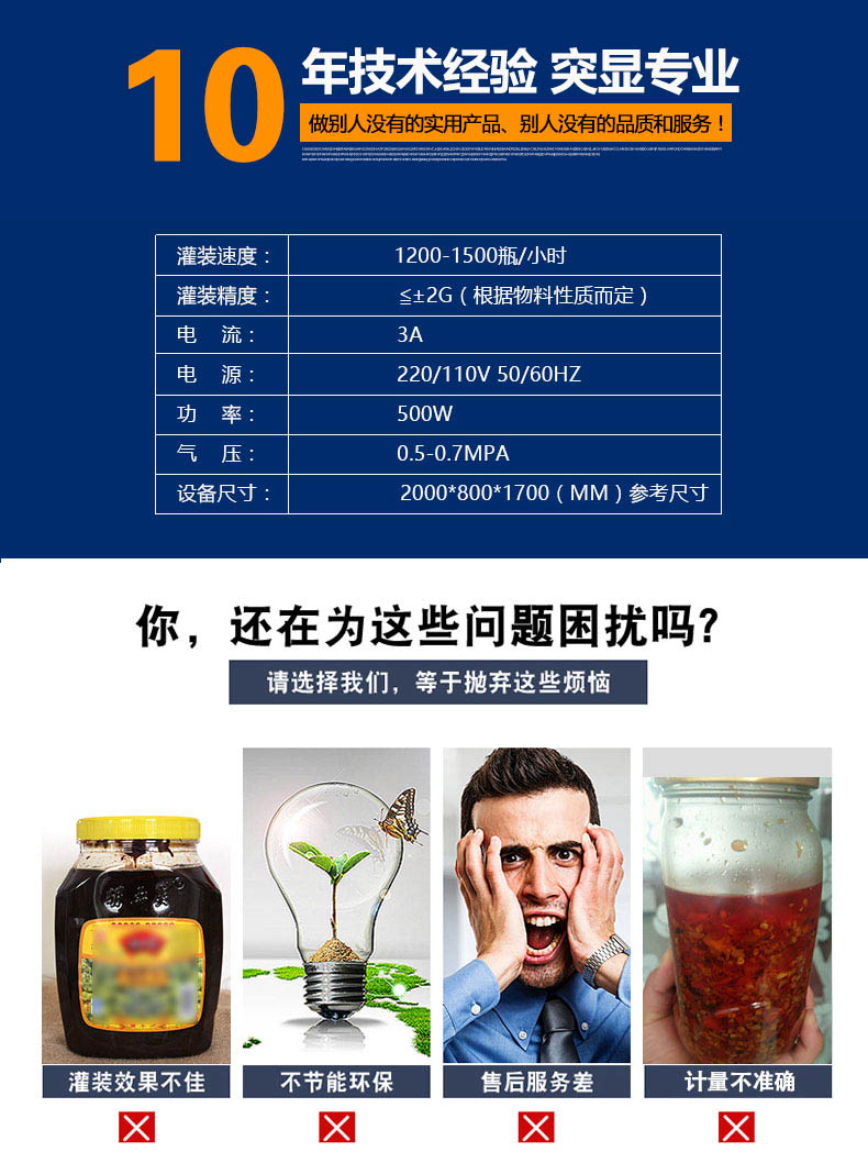 2.灌裝機采用橫推料的方式,大大縮短了下料斗到灌裝頭的距離,提高了灌裝速度,更重要的是解決了含油量大的物料在灌裝過程中出現(xiàn)的有些瓶油多,有些瓶醬多的灌裝難題,大大提高了灌裝精度。