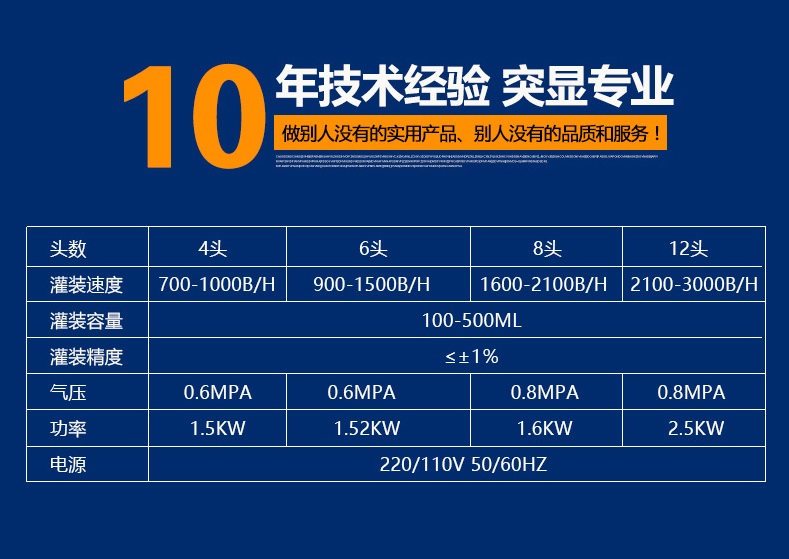 該生產(chǎn)線適合中小口徑三旋、四旋玻璃瓶調(diào)味醬的分裝,適合醬料、含顆粒黏稠物料的灌裝,物料接觸部分均采用316不銹鋼,整機(jī)304不銹鋼,符合食品衛(wèi)生標(biāo)準(zhǔn)。該機(jī)設(shè)計(jì)合理,機(jī)型小巧,立式結(jié)構(gòu),節(jié)省場(chǎng)地,操作方便。啟動(dòng)部分均采用德國(guó)FESTO和臺(tái)灣AirTack的氣動(dòng)元件。灌裝閥有氣動(dòng)閥控制,灌裝精度更高,灌裝量和灌裝速度均可任意調(diào)整,灌裝悶頭采用防拉絲及升降灌裝裝置。
