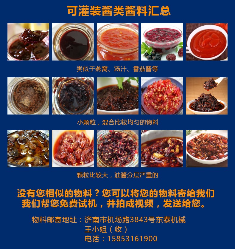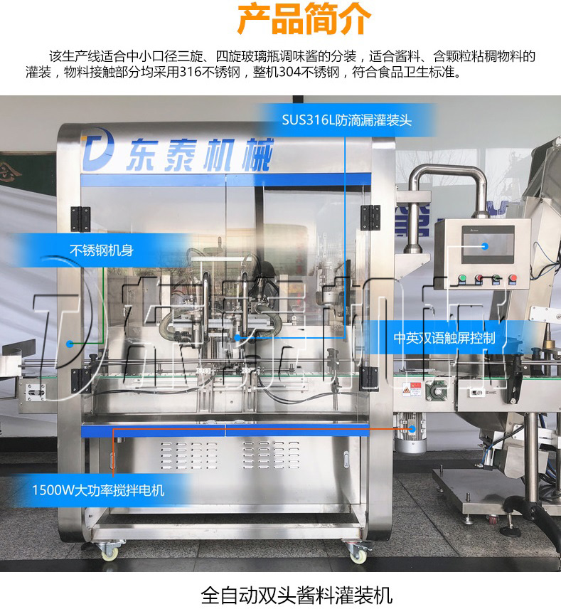 設(shè)備簡(jiǎn)介 該生產(chǎn)線適合中小口徑三旋、四旋玻璃瓶調(diào)味醬的分裝,適合醬料、含顆粒黏稠物料的灌裝,物料接觸部分均采用316不銹鋼,整機(jī)304不銹鋼,符合食品衛(wèi)生標(biāo)準(zhǔn)。該機(jī)設(shè)計(jì)合理,機(jī)型小巧,立式結(jié)構(gòu),節(jié)省