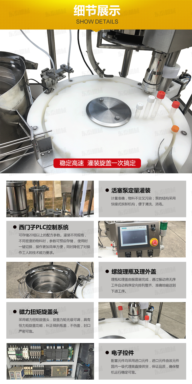 診斷試劑灌裝旋蓋一體機是在引進和吸收國外技術的基礎上,由我公司自主研發(fā)的一款IVD診斷試劑灌裝旋蓋一體機,能同時完成自動理瓶、自動上瓶、定量灌裝、自動理蓋、上蓋和旋蓋封口等動作。本機采用日本高精度封閉式凸輪分度工位器,精度高,運行可靠,使用壽命長。該分度器結構簡單,長期使用無需維修。該型號設備主要用于ⅣD體外診斷試劑制藥、生物制藥行業(yè)及科研領域裝。機器設計緊湊合理、外形簡潔美觀,灌裝量調節(jié)方便。